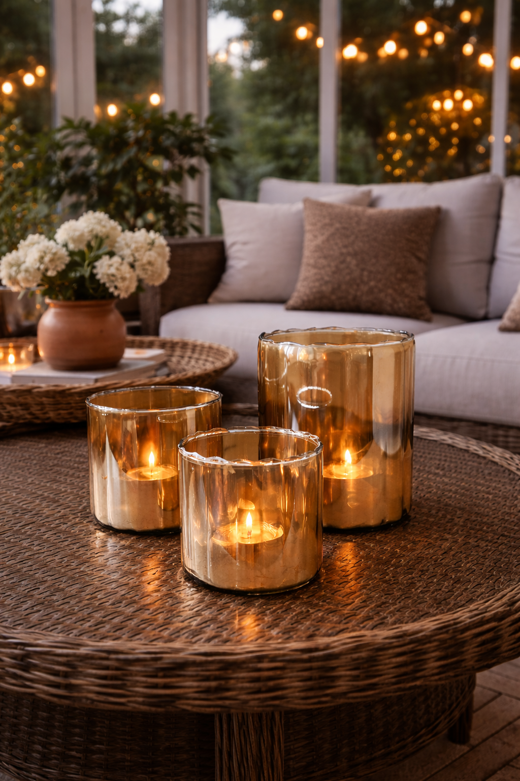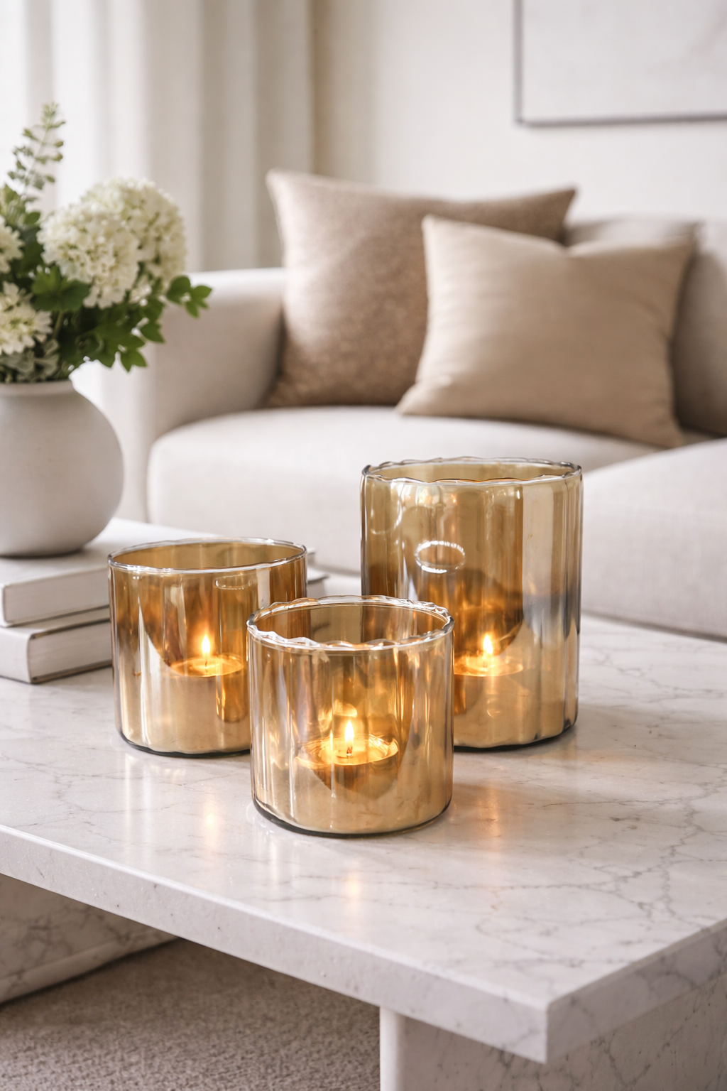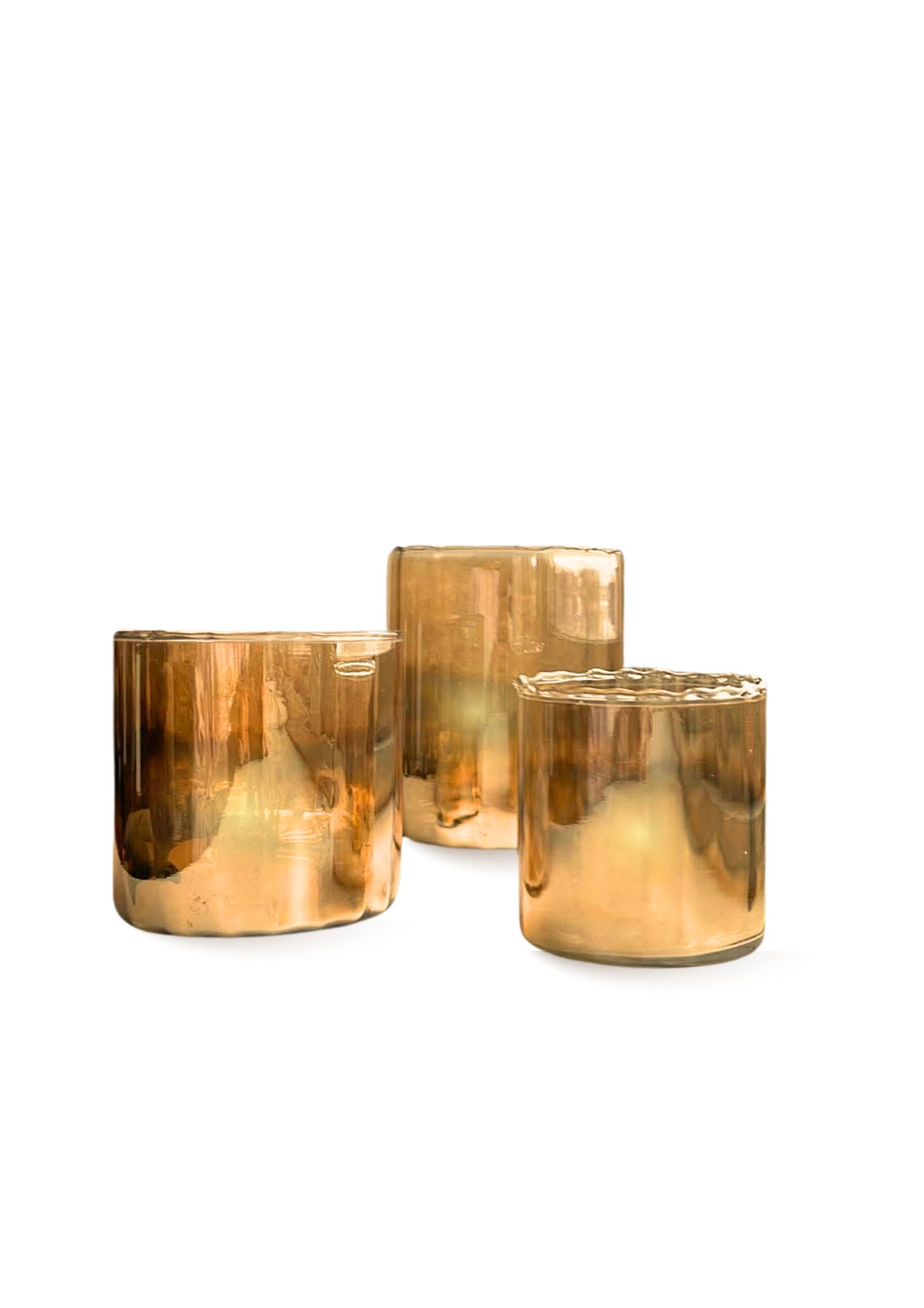 Ljuslyktor i varmt guldig ton i olika storlekar och former. Skapar en mysig stämning och sprider ett vackert sken i rummet.