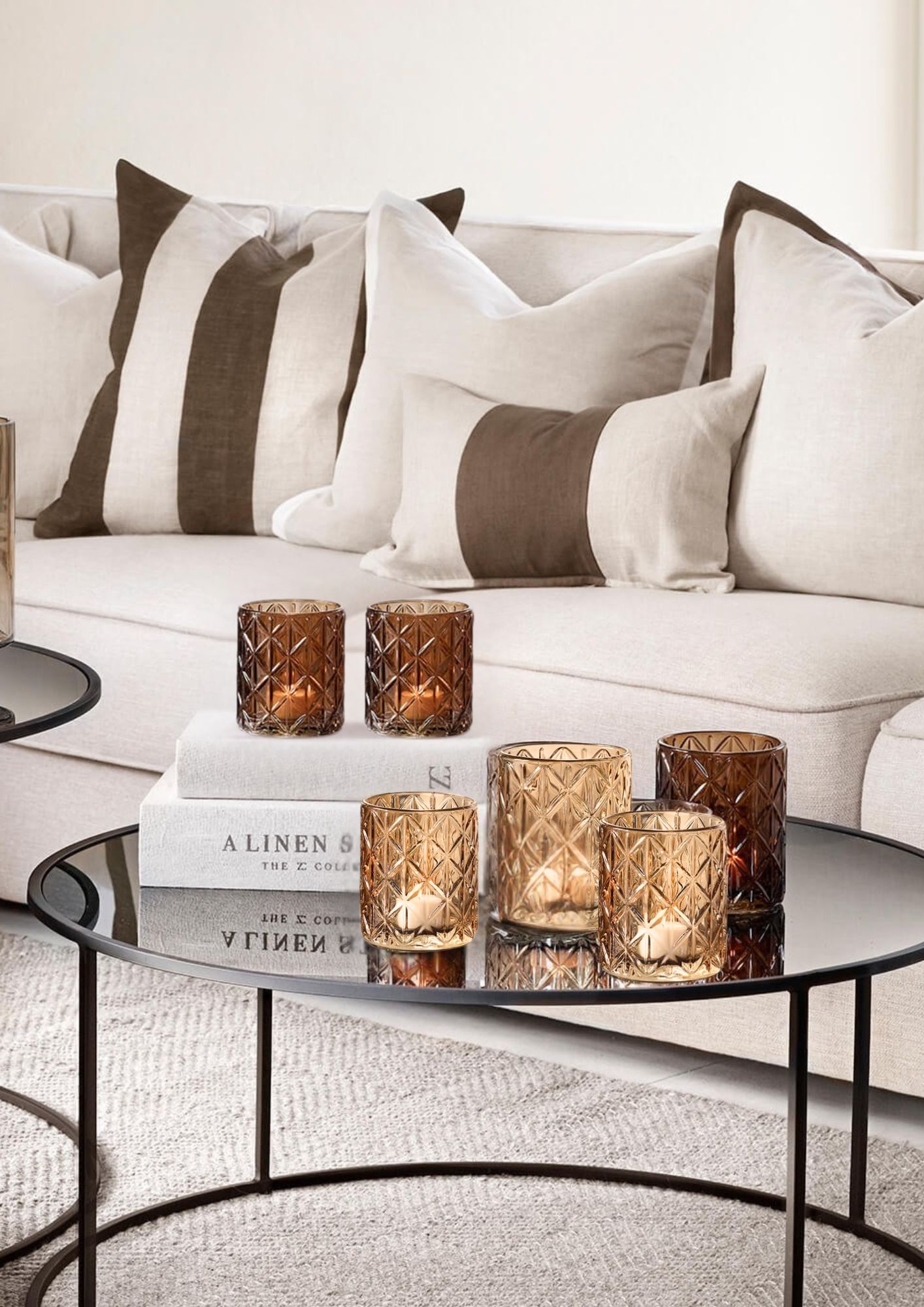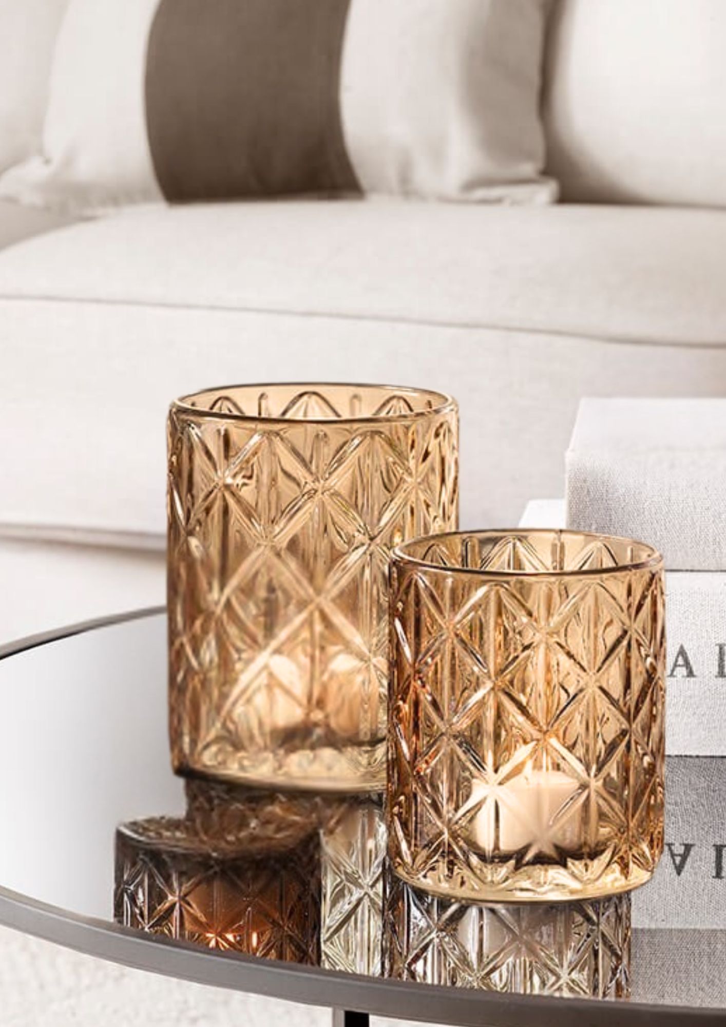 Lyktor i optisk glas med djupa skär som ger ett skimrande och gnistrande stämningsfullt ljus. En riktigt ljuvligt set.
