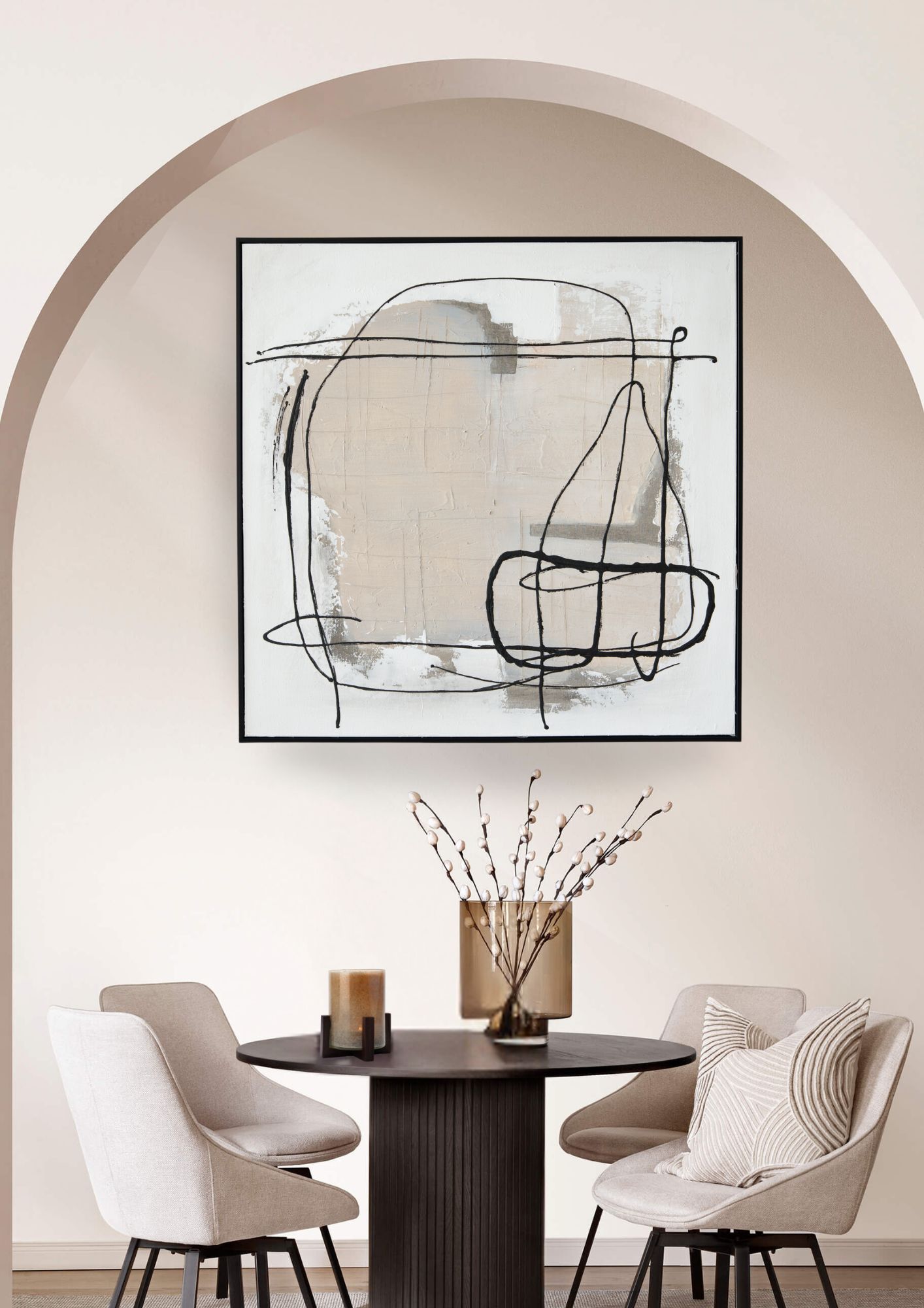 Handmålad canvas i beigea, vita och svarta toner med ram i brunt trä. Vacker tavla som ger en lyxig känsla i hemmet.