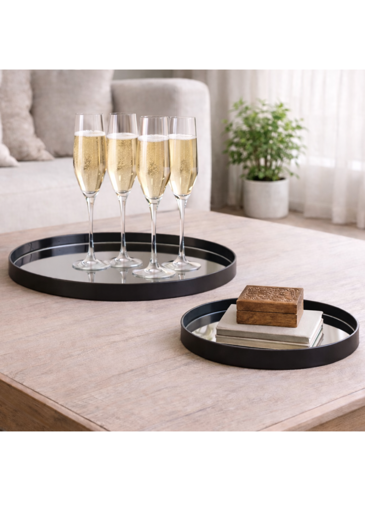 Denna vackra bricka kombinerar funktion och stil på ett sofistikerat sätt. Den glansiga spegelbotten reflekterar ljus och skapar en känsla av lyx. Perfekt för servering av drycker och snacks, eller som en dekorativ detalj för att visa upp dina favoritsaker. Metall & glas