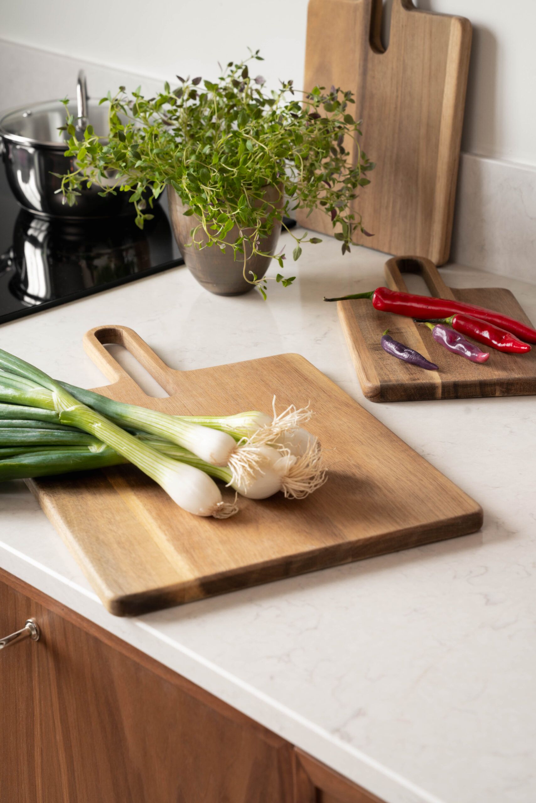 Serveringsbricka som är vacker att ha stående i köket har ett handtag som gör att du kan hänga upp den när den inte används. Den mångsidiga serveringsbrickan kan även användas som skärbräda till exempelvis bröd. Finns i flera olika storlekar.